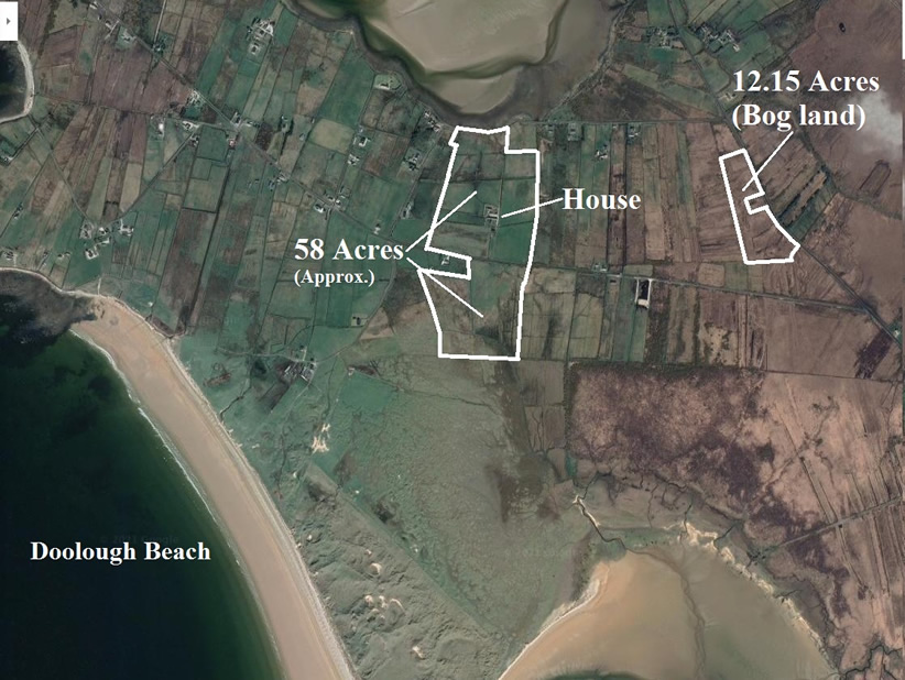 Four bedroom dwelling house known locally as Doolough Lodge, which is placed on approximately 58 acres of excellent quality agricultural land, together with applicable basic farm entitlements. There is approximately 40 acres of land around the house and the remaining 18 acres is located across the Doolough road. There is also an additional 12.15 Acres of bog land included in the sale which is located on the main Belmullet to Geesala road (approx. 2 km from Doolough lodge).